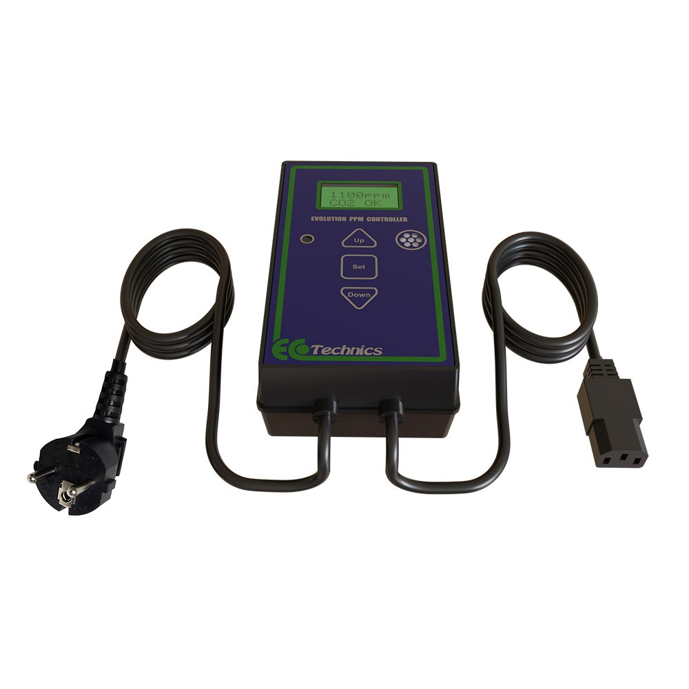 Der intelligente und stilvolle Regler EcoTechnics Evolution PPM kann entweder an ein elektromagnetisches Ventil oder an einen Propangasbrenner angeschlossen werden, um den CO2-Gehalt im Anbau Raum zu erhöhen.