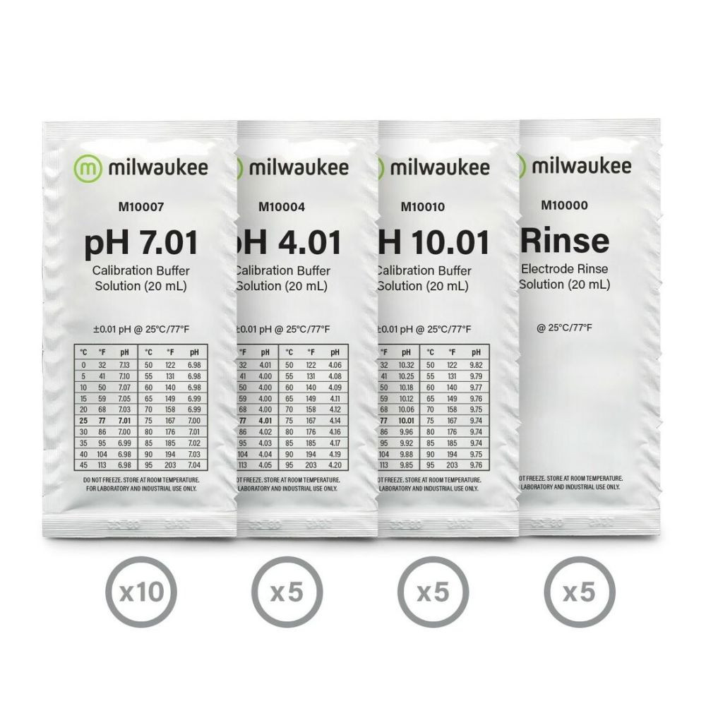 Die Elektrodenspüllösung sollte nicht die Reinigungs- oder Lagerlösungen ersetzen. Die Verpackung in Beuteln bedeutet, dass Sie jedes Mal eine frische Lösung erhalten. Ideal für den gelegentlichen Gebrauch oder den Einsatz im Feld. Kein Risiko, eine abgelaufene Kalibrierlösung zu verwenden. Die Milwaukee-Lösungen sind so konzipiert, dass sie zuverlässige und wiederholbare Messungen ermöglichen und gleichzeitig die Lebensdauer der Elektroden verlängern.