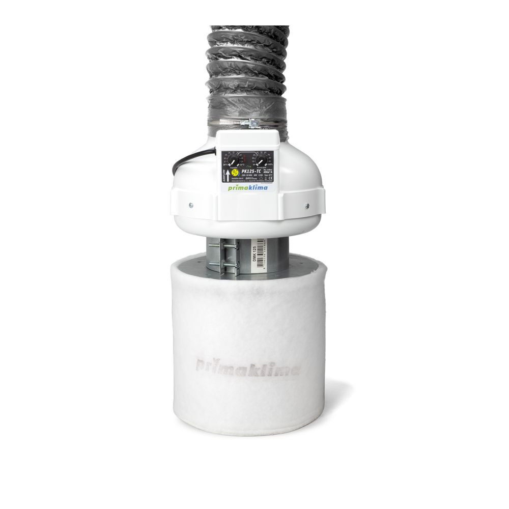 Das komplette Belüftungsset Prima Klima PK125-TC umfasst einen leistungsstarken Ventilator mit temperaturgesteuerter Drehzahlregelung, einen effizienten Geruchsfilter mit Aktivkohle, einen langlebigen 3 m langen Belüftungskanal, einen Spannclip und eine Anschlussmanschette.