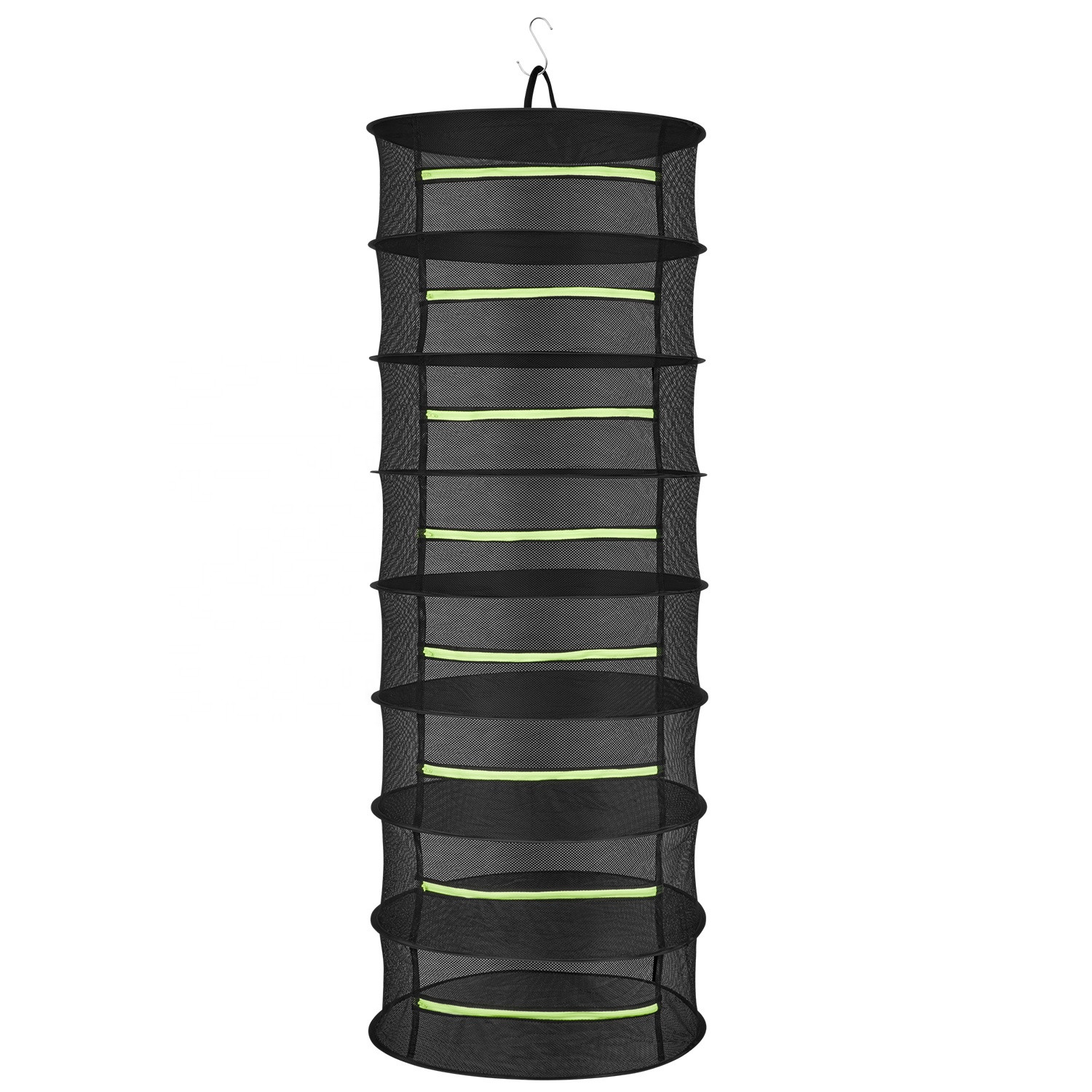 Zusammenklappbares Trockennetz. Höhe des Trockennetzes: 160cm. Durchmesser des Trockennetzes: 90cm. 8 Etagen, die zum Trocknen von Obst, Kräutern und Blumen genutzt werden können. Das Trockennetz kann bequem in Anbaupflanzenzelten aufgehängt werden.