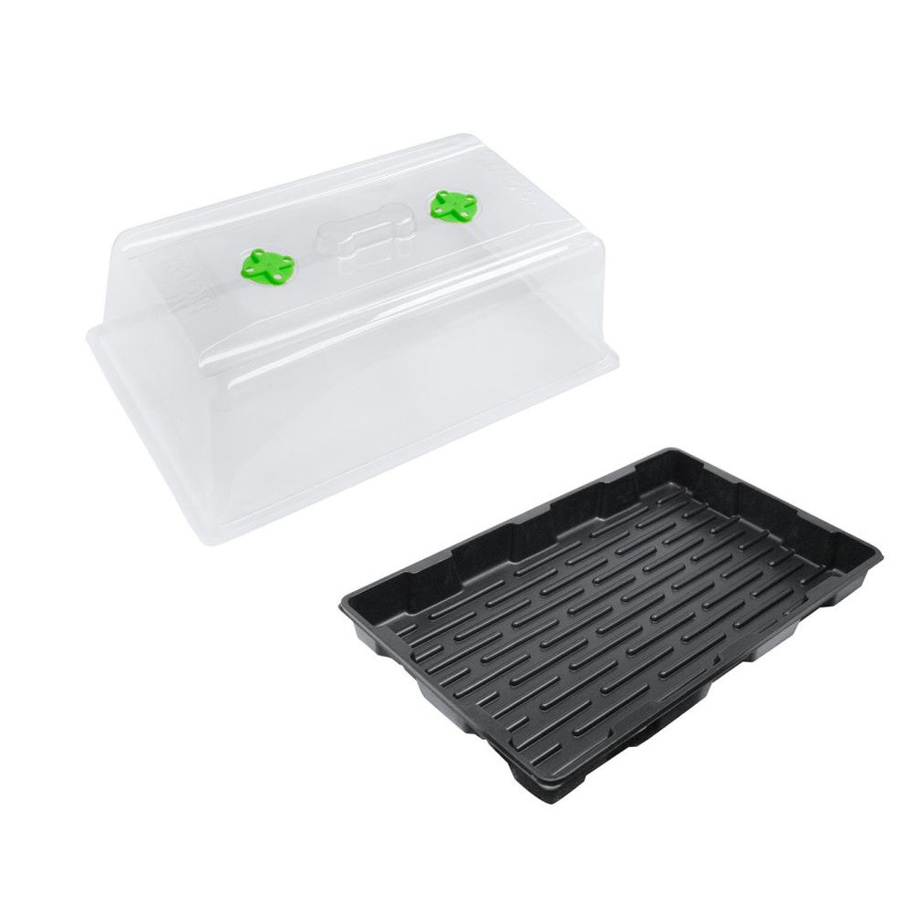 Der plastische ROOT!T Propagator wird ohne Stecklingsschale und Medium geliefert, nur mit einer unteren Schale und einem transparenten Deckel mit Aussparung für LED-Beleuchtung. Der kompatible Stecklingsschale mit kreisrunden Löchern ROOT!T Propagator Insert und das Medium ROOT!T Natural Rooting Sponges müssen separat erworben werden.